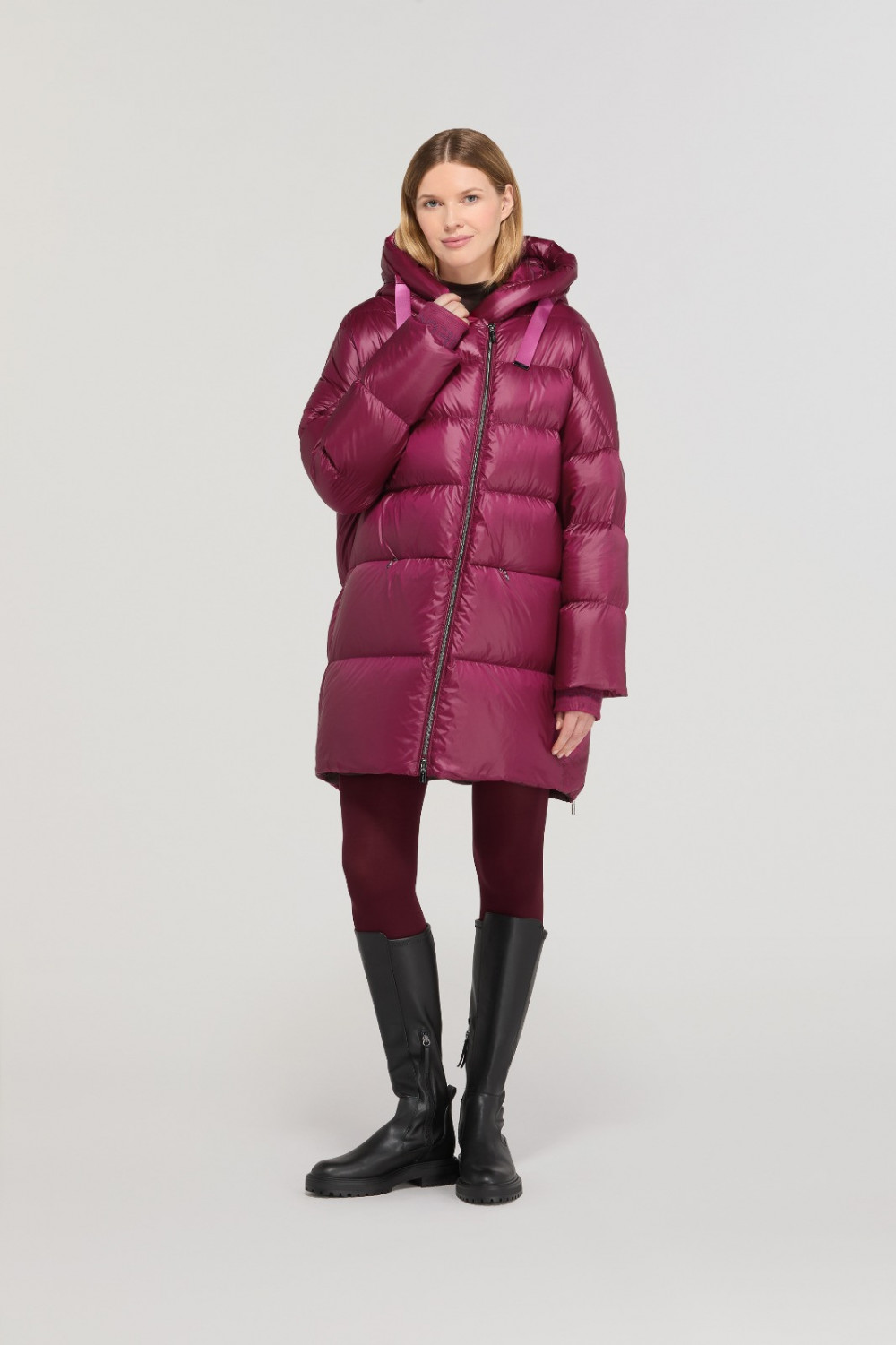 Dłuższa kurtka puchowa z kapturem - włoskiej marki DIEGO M , zapinana na ukośny zamek , z tyłu posiada pionowe zamki po dwóch stronach z boku - oraz dwa małe pionowe zameczki na kapturze (tył) .