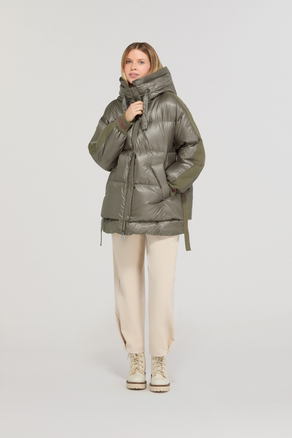 Puchowa kurtka włoskiej marki Diego M z kapturem i bordo podszewką w środku .Posiada dzianinowe wstawki lampasów na rekawiach w kolorze zielonym oraz ściągacze z logo (również z dzianiny). Dodatkowo ukryte krótkie zamki po bokach.